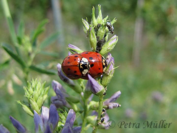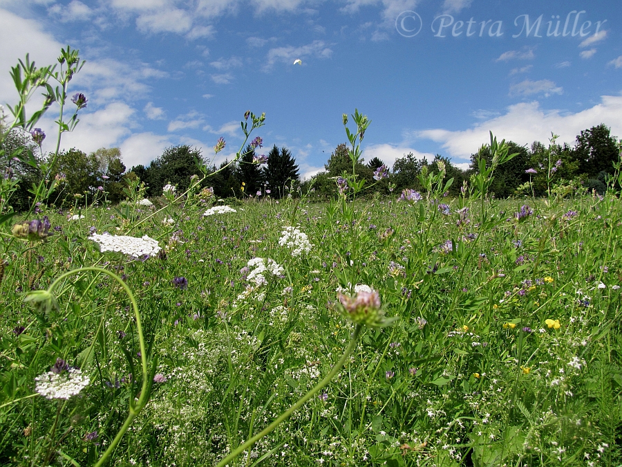 Wenn man sich statt auf eine Bank, direkt in die Wiese setzt, wird man Teil dieser Welt. Alle kleinen Tiere scheinen immer unterwegs zu sein; sie fliegen, schwirren, hüpfen und krabbeln.
