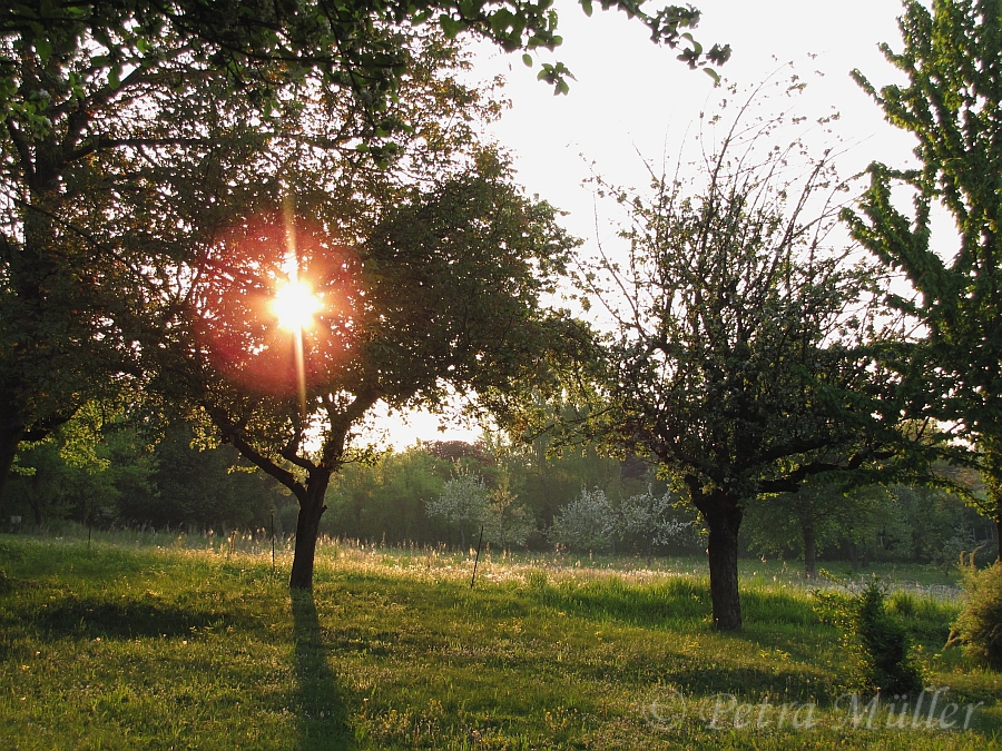 Ich mochte ihn auf Anhieb. Wie er da auf der Wiese stand, die Äste weit ausgebreitet, lud er mich ein, mich doch ein wenig zu ihm zu setzen. Einladungen von Bäumen nehme ich immer gerne an. Wenn ich dort vorbei kam, setzte ich mich zu ihm und sah zu, wie sich im Wechsel der Jahreszeiten Blüten und Blätter und später dann erst winzige Früchte bilden. Sie wuchsen beim Zusehen, bis sie im Herbst zu diesen wunderschönen Früchten heranreiften, goldglänzend und saftig.